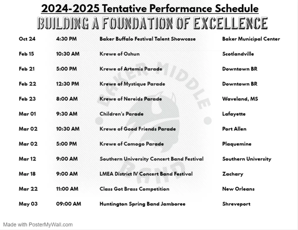 The motto of the Baker Middle School Band Department is, "Building a Foundation of Excellence." The success of the band department depends heavily on 100% participation from the teacher, students, and parents. At BMS, students are expected to remain in their seats at all times, treat others and their property with respect, and follow all school-wide rules and procedures. It is the goal of the band to facilitate a safe, respectful, and productive musical learning environment for all students.